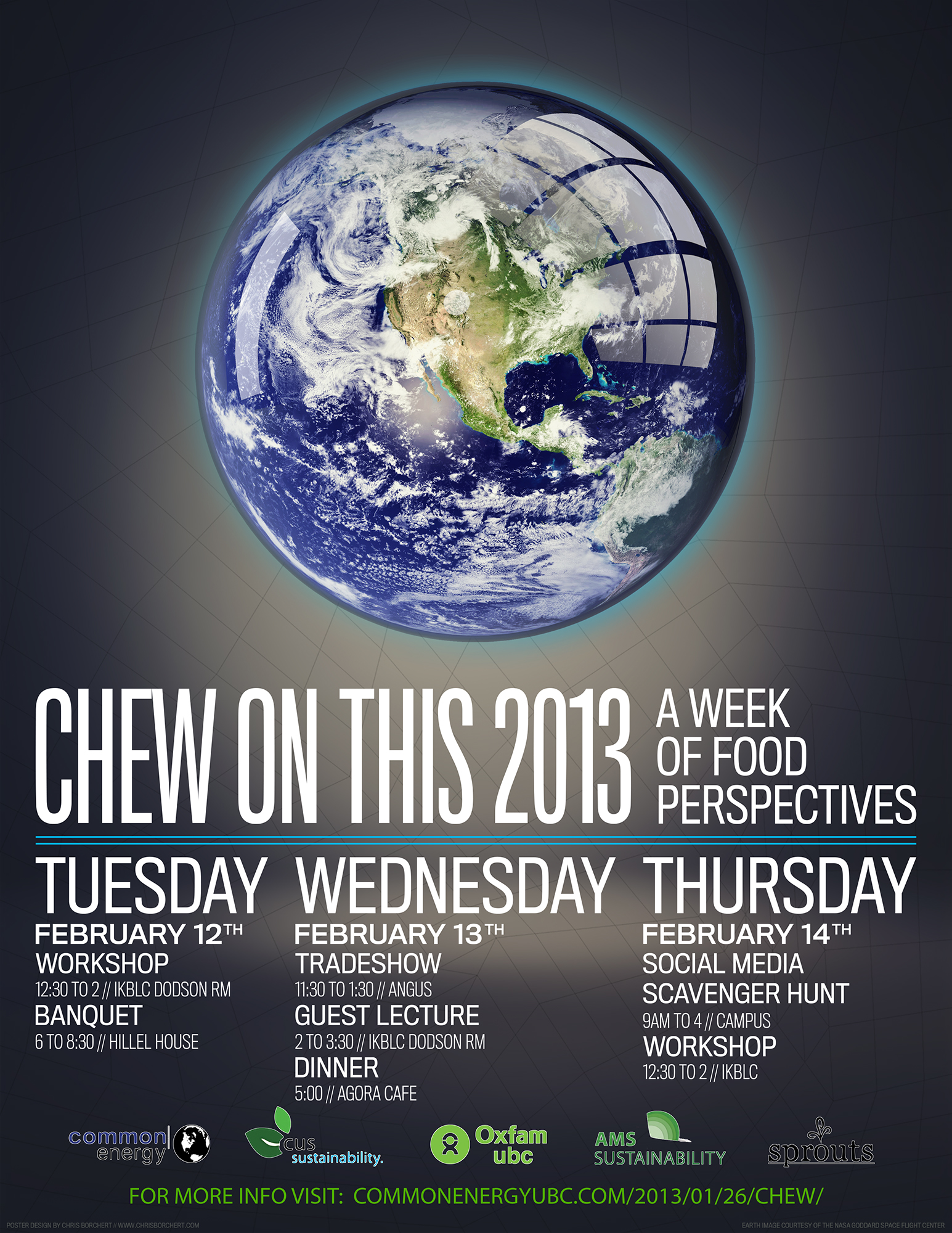 Chew On This 2013 is a collaborative event from CUS Sustainability, Common Energy and Oxfam UBC. Over February 12th to 14th (Tuesday to Thursday), a variety of academics, business people and workshop facilitators will educate the UBC community about sustainable food and food security. The majority of these sessions will be free of charge to participants and interactive education will be emphasized, on food issues such as local sourcing, food security, fair trade, and more.